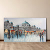 With stunning dark themed play of colors, Blue Sunday's Market is an impressive landscape art painting. The people that are walking carelessly, together with the amazing attention to detail and color create an artistic feel bringing an immersive experience to any room.