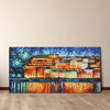 An oil painting on canvas depicting a colorful cityscape at night with reflecting lights on water, gallery wrap with wood frame.
