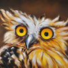 A hand-painted canvas artwork of an owl with a surprised expression, featuring prominent yellow eyes and brown feathers, gallery wrap stretched on a wood frame.